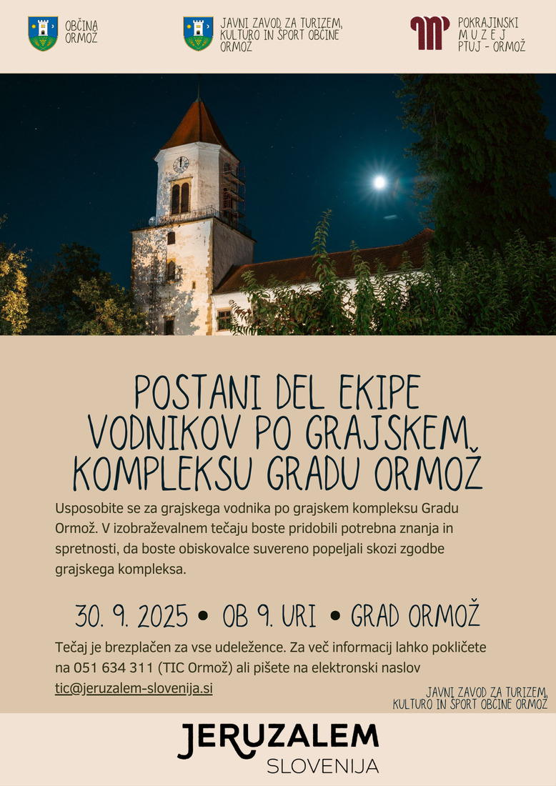 Javni zavod za turizem, kulturo in šport Občine Ormož razpisuje izobraževalni tečaj za vodnike po grajskem kompleksu gradu Ormož, ki bo potekal v torek, 30. septembra 2025 ob 9.00 uri.