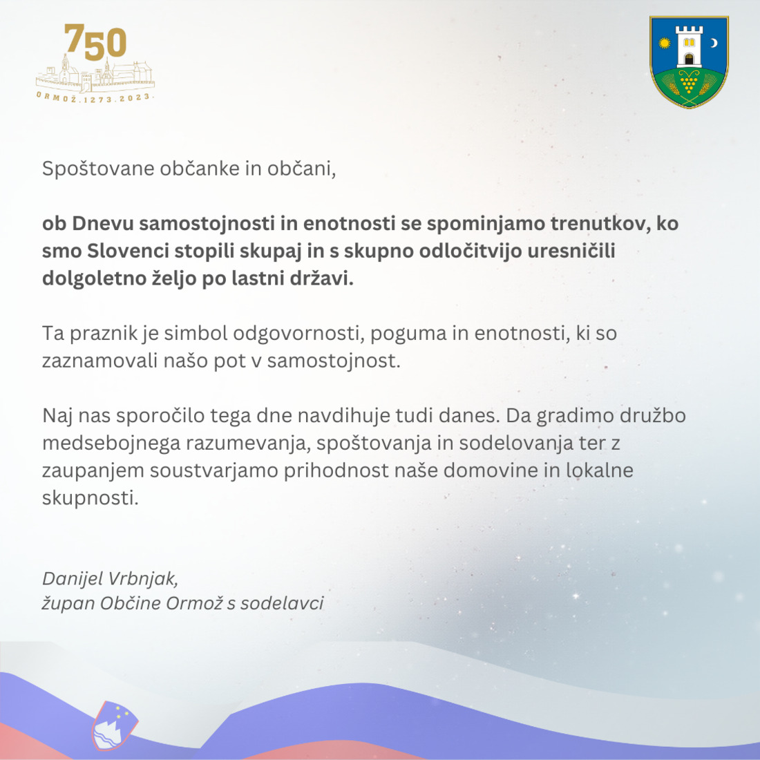 ob Dnevu samostojnosti in enotnosti se spominjamo trenutkov, ko smo Slovenci stopili skupaj in s skupno odločitvijo uresničili dolgoletno željo po lastni državi. Ta praznik je simbol odgovornosti, poguma in enotnosti, ki so zaznamovali našo pot v samostojnost.