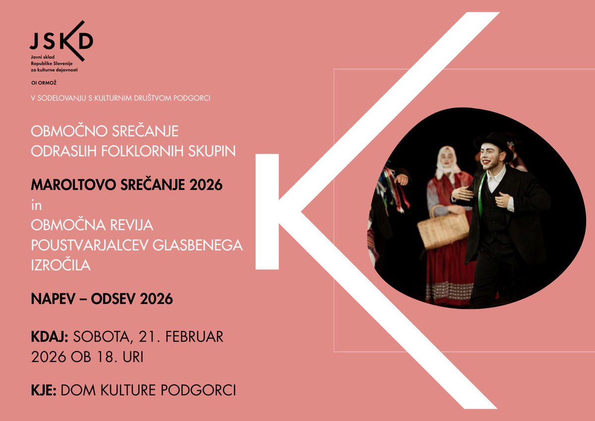 Vljudno vabljeni na območno srečanje odraslih folklornih skupin / Maroltovo srečanje / in revijo poustvarjalcev glasbenega izročila / Napev – odsev /, ki bo v soboto, 21. februarja 2026, ob 18. uri v Domu kulture Podgorci.