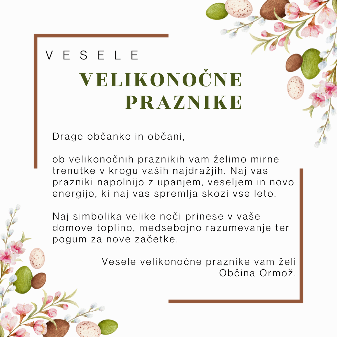 Naj simbolika velike noči prinese v vaše domove toplino, medsebojno razumevanje ter pogum za nove začetke.