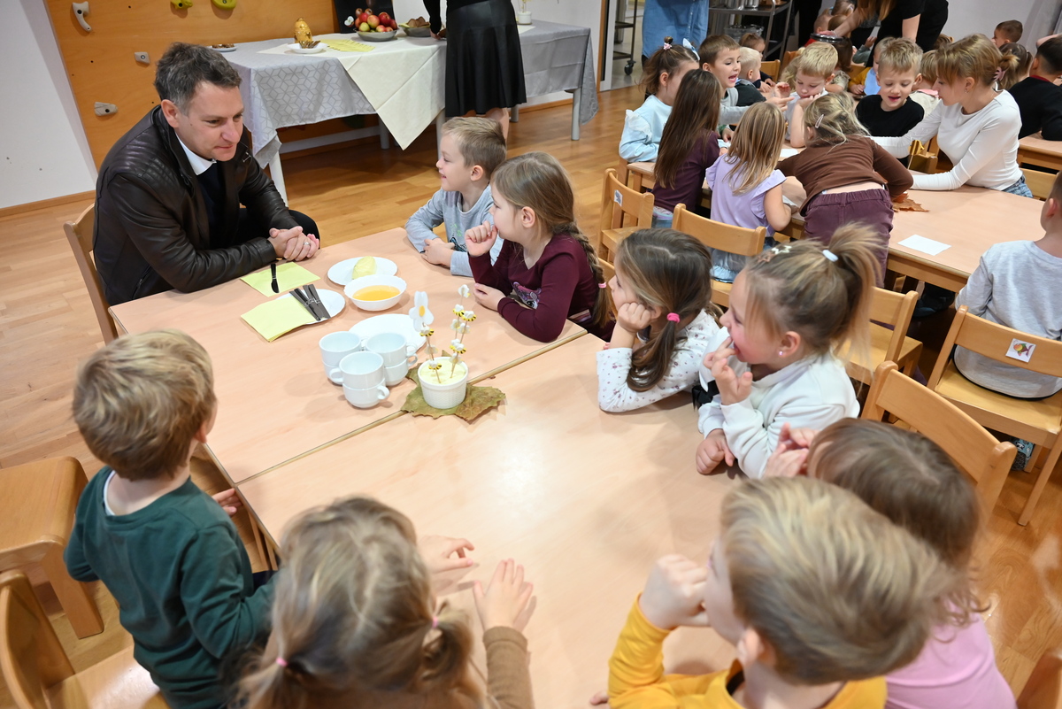 Župan se zahvaljuje otrokom in zaposlenim v vrtcu za prijeten sprejem ter za priložnost, da skupaj z najmlajšimi soustvarja spoštovanje do slovenske hrane in lokalnega okolja.