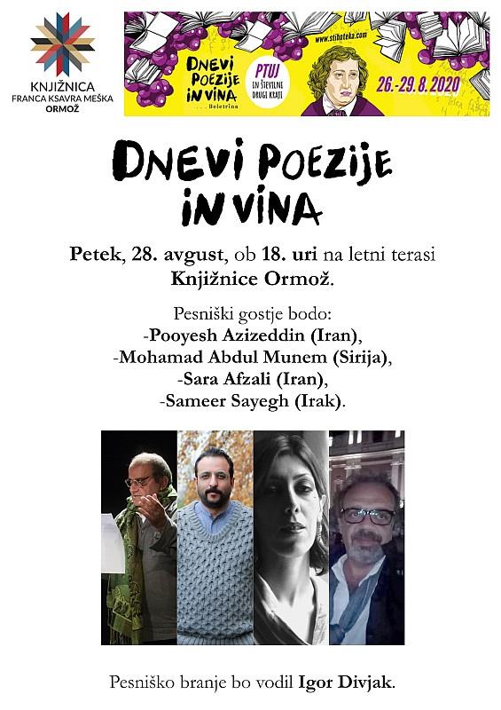 Pesniško branje se bo odvilo tudi v Ormožu, in sicer v petek, 28. avgusta 2020, ob 18. uri, na letni terasi Knjižnice Franca Ksavra Meško Ormož. Gostili bomo štiri avtorje (iz Sirije, Irana in Iraka). Dogodek bo povezoval Igor Divjak.