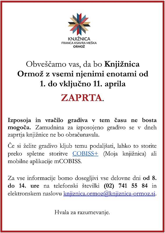 obveščamo vas, da bo knjižnica z vsemi njenimi enotami v skladu z Odlokom o začasni prepovedi ponujanja kulturnih in kinematografskih storitev končnim uporabnikom v Republiki Sloveniji (Uradni list RS, št. 47/2021) od 1. do vključno 11. aprila ZAPRTA.