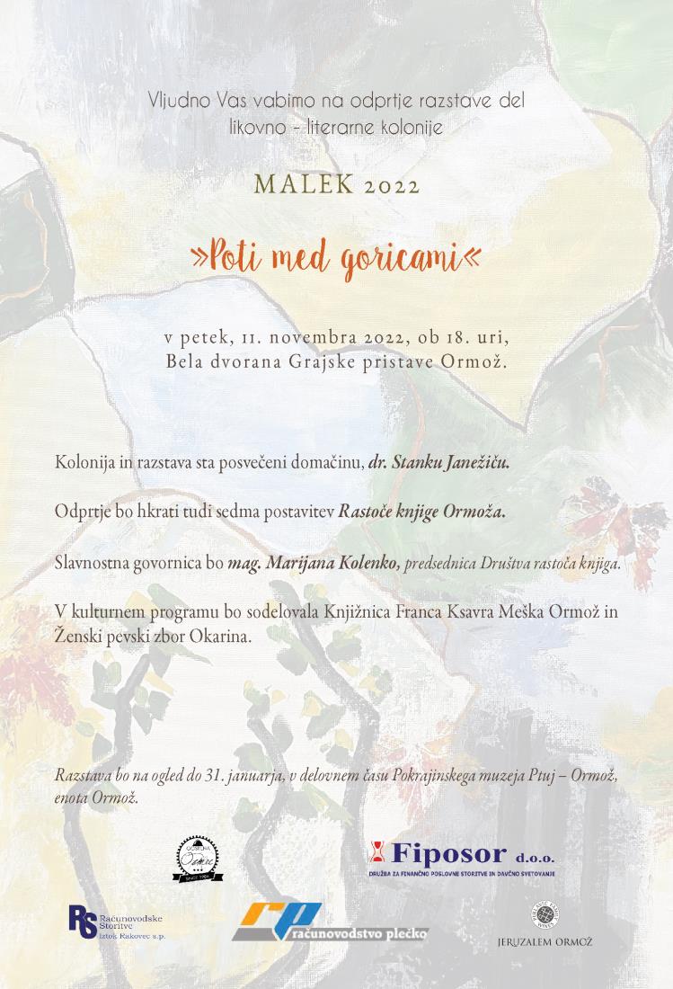 Tudi v letošnjem letu so se ljubiteljski likovni in literarni ustvarjalci ter fotografi iz celotne Slovenije in tujine že desetič zapovrstjo družili na dvodnevni likovno - literarni koloniji Malek 2022, ki jo pripravlja JSKD OI Ormož v sodelovanju s podjetjem Puklavec Family Wines, likovno kulturnim društvom Ormož in kulturno umetniškim društvom Prasila iz Središča ob Dravi.