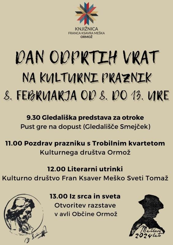Knjižnica Ormož vas ob slovenskem kulturnem prazniku v četrtek, 8. februarja 2024, med 8. in 13. uro vabi na dan odprtih vrat.