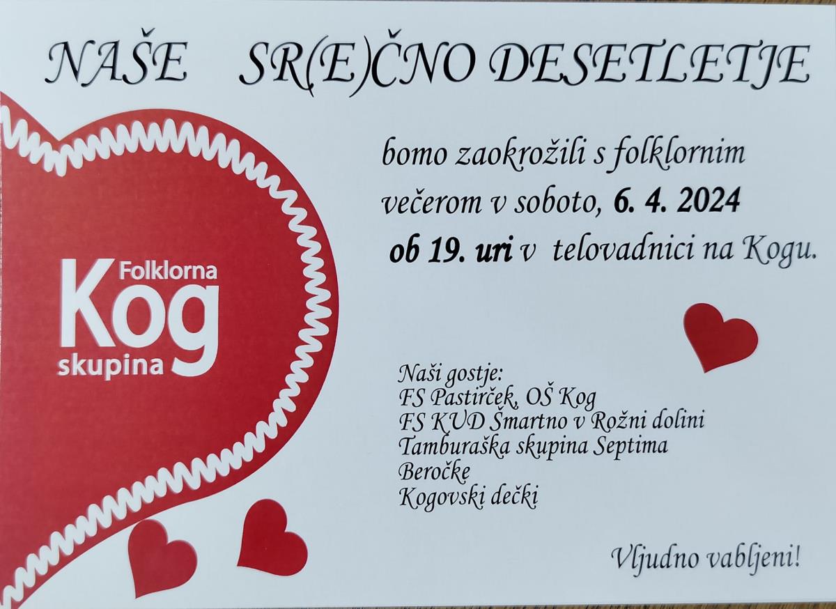 FS Kog praznuje 10 let delovanja. Ob tej priložnosti pripravlja folklorni večer, ki bo v telovadnici OŠ Kog.